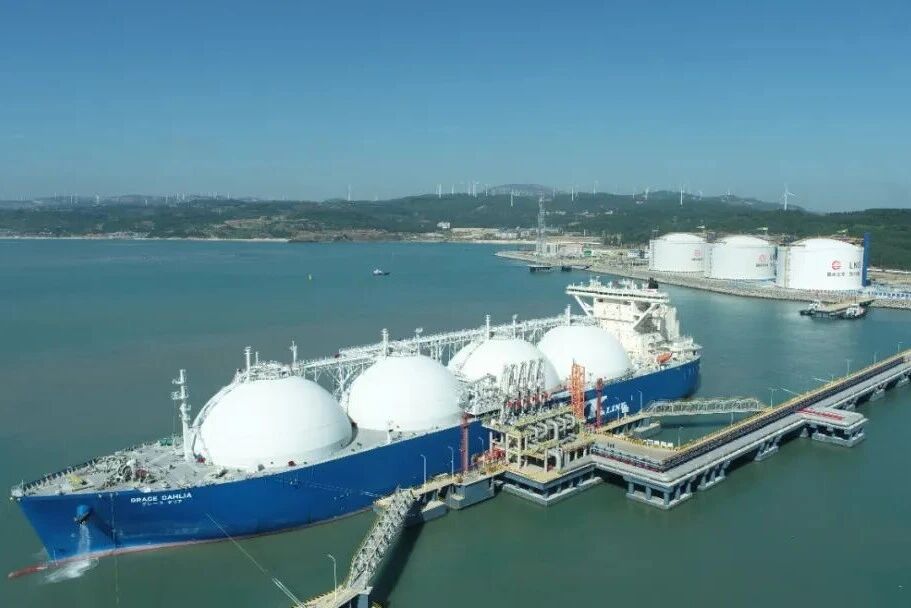 图为11月16日,装载6.1万吨进口LNG的运输船靠泊漳州LNG接收站