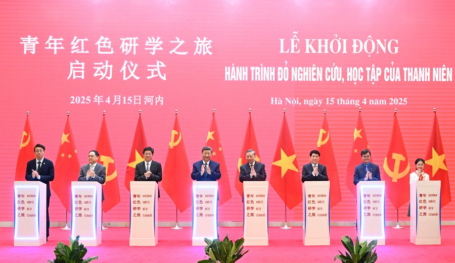 4月15日上午,中共中央总书记、国家主席习近平在河内国际会议中心同越共中央总书记苏林、越南国家主席梁强共同会见中越人民大联欢活动代表。这是活动后,习近平和苏林、梁强共同启动“红色研学之旅”项目。新华社记者 申宏 摄