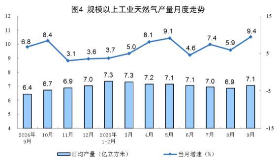 天然气生产增速加快。9月份,规上工业天然气产量212亿立方米,同比增长9.4%,增速比8月份加快3.5个百分点;日均产量7.1亿立方米。