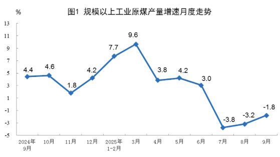 原煤生产降幅收窄。9月份,规上工业原煤产量4.1亿吨,同比下降1.8%,降幅比8月份收窄1.4个百分点;日均产量1372万吨。