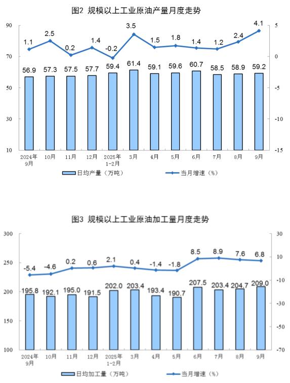 原油生产增速加快。9月份,规上工业原油产量1777万吨,同比增长4.1%,增速比8月份加快1.7个百分点;日均产量59.2万吨。
