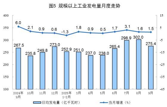 规上工业电力生产平稳增长。9月份,规上工业发电量8262亿千瓦时,同比增长1.5%;日均发电275.4亿千瓦时。1—9月份,规上工业发电量72557亿千瓦时,同比增长1.6%。