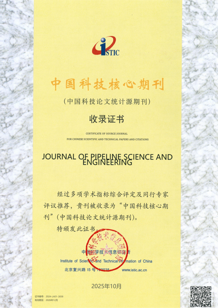 2025年10月30日,中国科学技术信息研究所正式发布2025年版《中国科技核心期刊目录》,由国家管网集团主管研究总院主办的国际唯一管道工程领域英文学术期刊《Journal of Pipeline Science and Engineering》(简称JPSE)成功入选“中国科技核心期刊”。