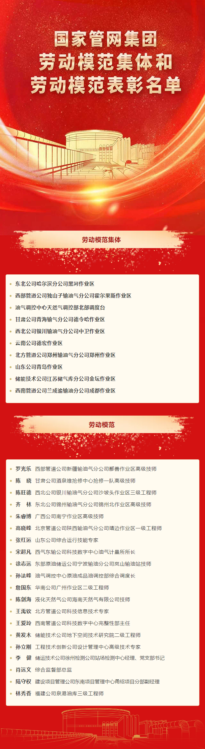 为表彰先进、树立典型,进一步弘扬劳模精神、劳动精神、工匠精神,激发广大干部员工爱岗敬业、创新创造的积极性和主动性,集团公司决定授予东北公司哈尔滨分公司黑河作业区等10个集体“国家管网集团劳动模范集体”称号,授予西部管道公司新疆输油气分公司鄯善作业区罗光乐等20名同志“国家管网集团劳动模范”称号。