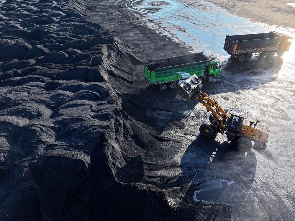 2025年12月5日,在江苏省连云港煤炭码头,运输卡车正在转运电煤。