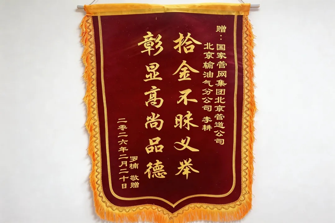 农历新年前夕,北京管道公司员工李耕路过房山区半壁店村时,发现路边遗落一个装有大额现金的红包。当时天色已暗、寒风刺骨,他仍选择原地等候失主。久等无果后,一边报警求助,一边联系村干部,发动村民,逐户询问,最终成功联系上失主。那是一位耳蜗宝宝的新年红包,承载着孩子康复的希望。失主专程送来锦旗当面感谢。李耕真诚地说:“我是国家管网的员工,也是一名党员,诚信做人、为民办事是本分。”