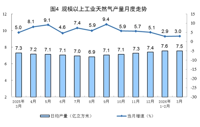 天然气生产增速加快。3月份,规上工业天然气产量234亿立方米,同比增长3.0%,增速比1—2月份加快0.1个百分点;日均产量7.5亿立方米。