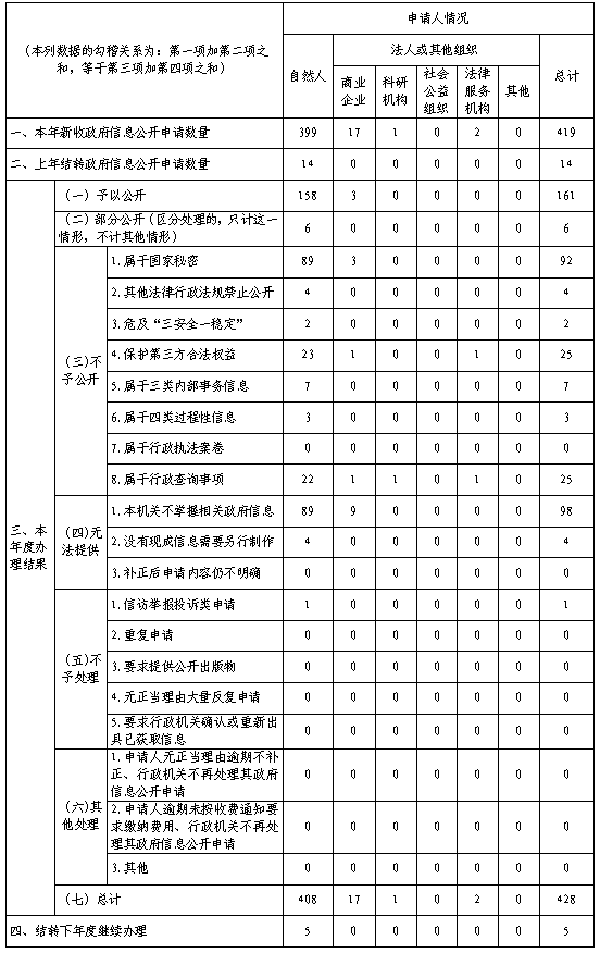 (二)依申请公开情况。全年共收到信息公开申请419件,上年度结转14件,已按规定办结428件,结转下年度办理5件。已办结的申请中,予以公开161件、部分公开6件、不予公开158件、无法提供102件、不予处理1件;因信息公开被申请行政复议0件、提起行政诉讼3件。提起的行政诉讼,均为未经复议直接起诉件,其中结果维持2件,尚未审结1件。