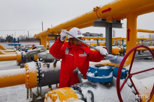 工作人员正在扫除阀门上的积雪(央广网发 国家管网供图)
