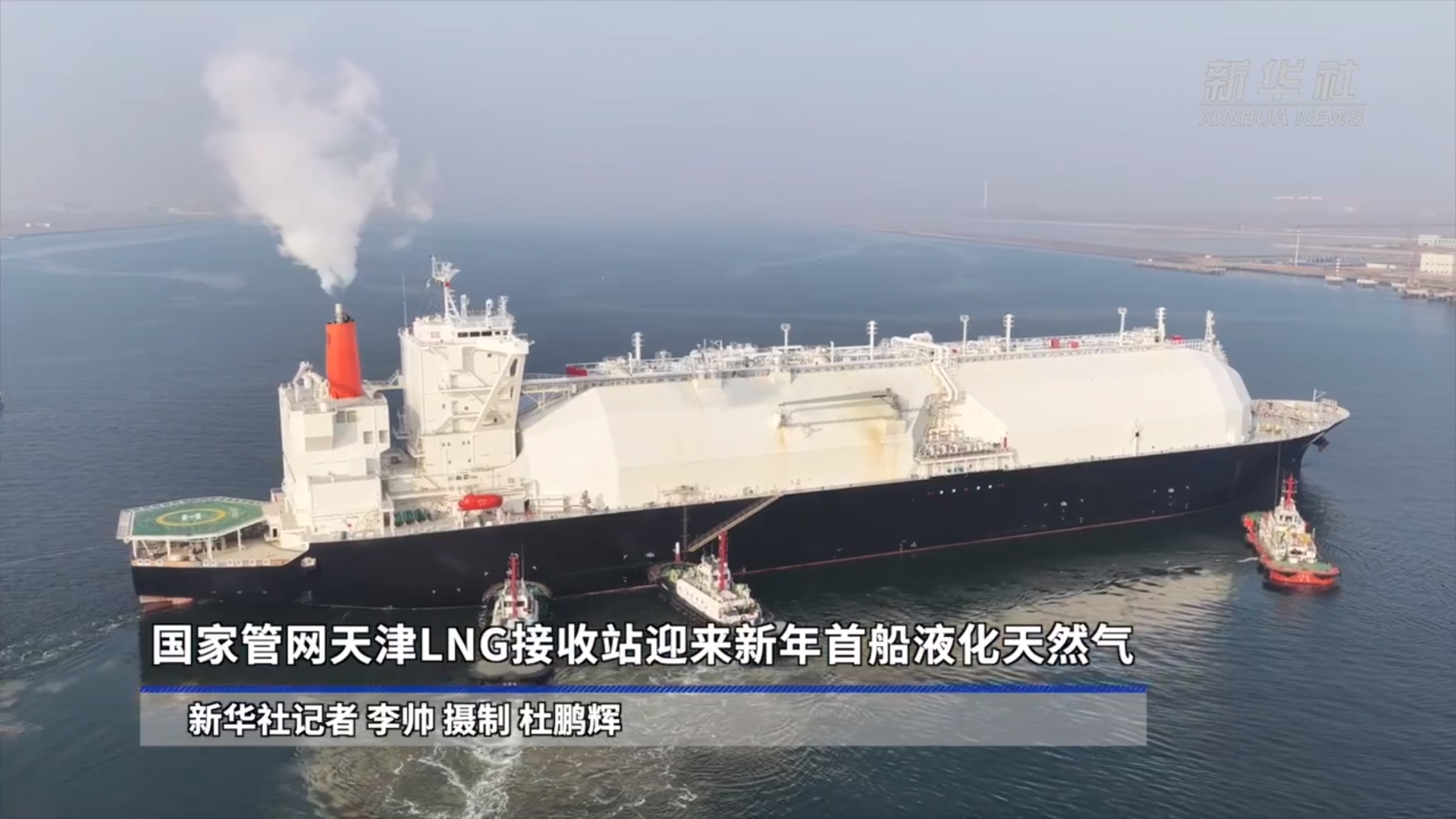 1月5日,装载6.44万吨液化天然气(LNG)的“马斯”号船舶安全靠泊国家管网集团天津LNG接收站码头。这是该接收站在2026年迎来的首船LNG接卸作业。记者:李帅摄制:杜鹏辉新华社音视频部制作